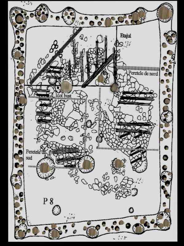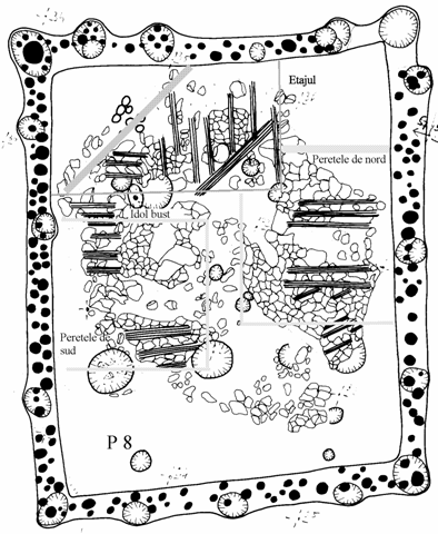 The south sanctuary covered a part of the destroyed construction (from level 5a). It destroyed a small part of the north wall, on the northwest corner of this construction. The wooden structure of the P8 was massive with thick soldering. The clay ruins had about 30-50 cm thickness. The plan of P8 construction had a parallelogram form (Parţa I.2, pl. 73/1-2 Between the principal pillars (at 1.5-1.8m distance) the wooden structure was different from a wall to another, from a zone to another. |