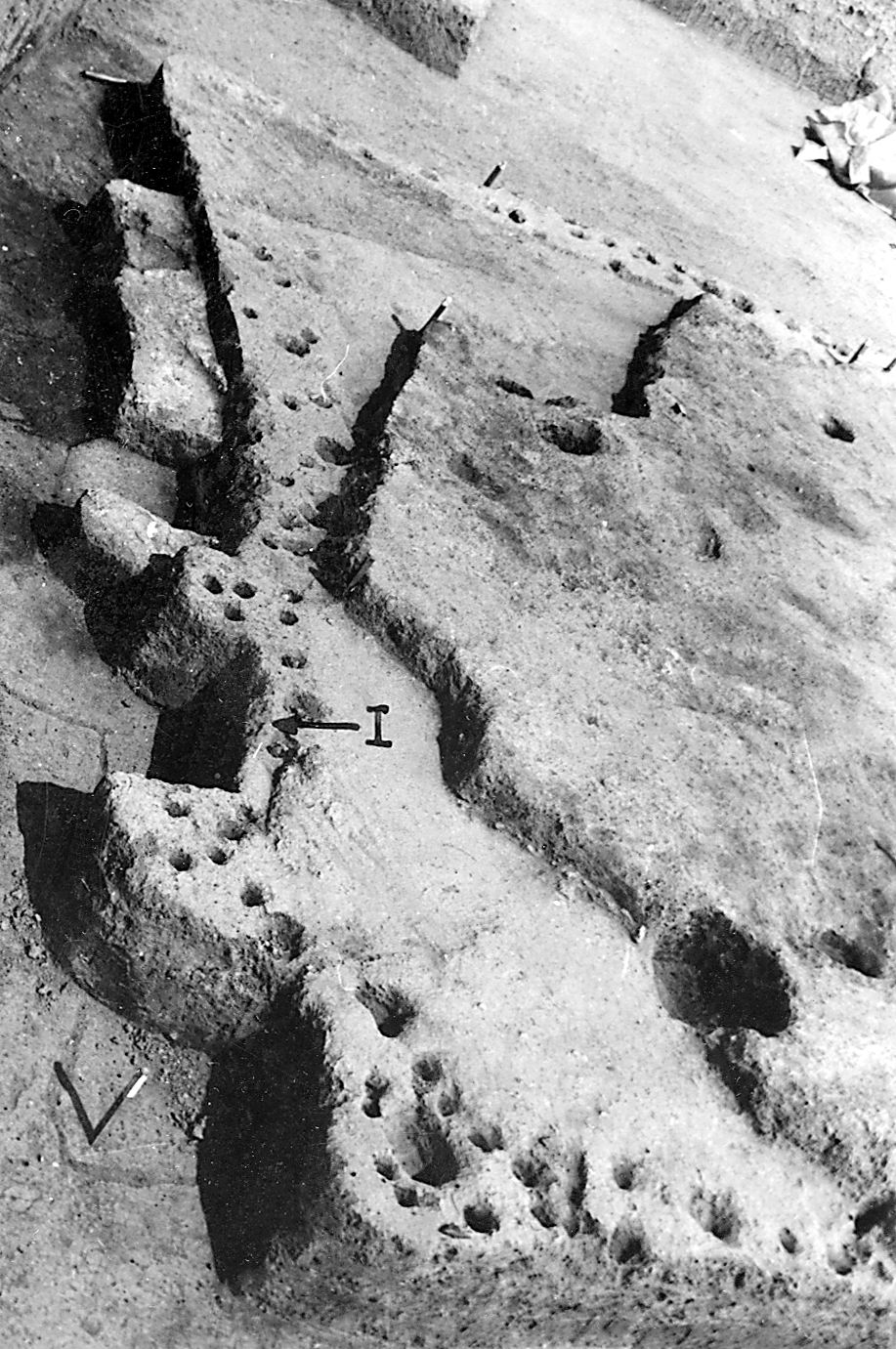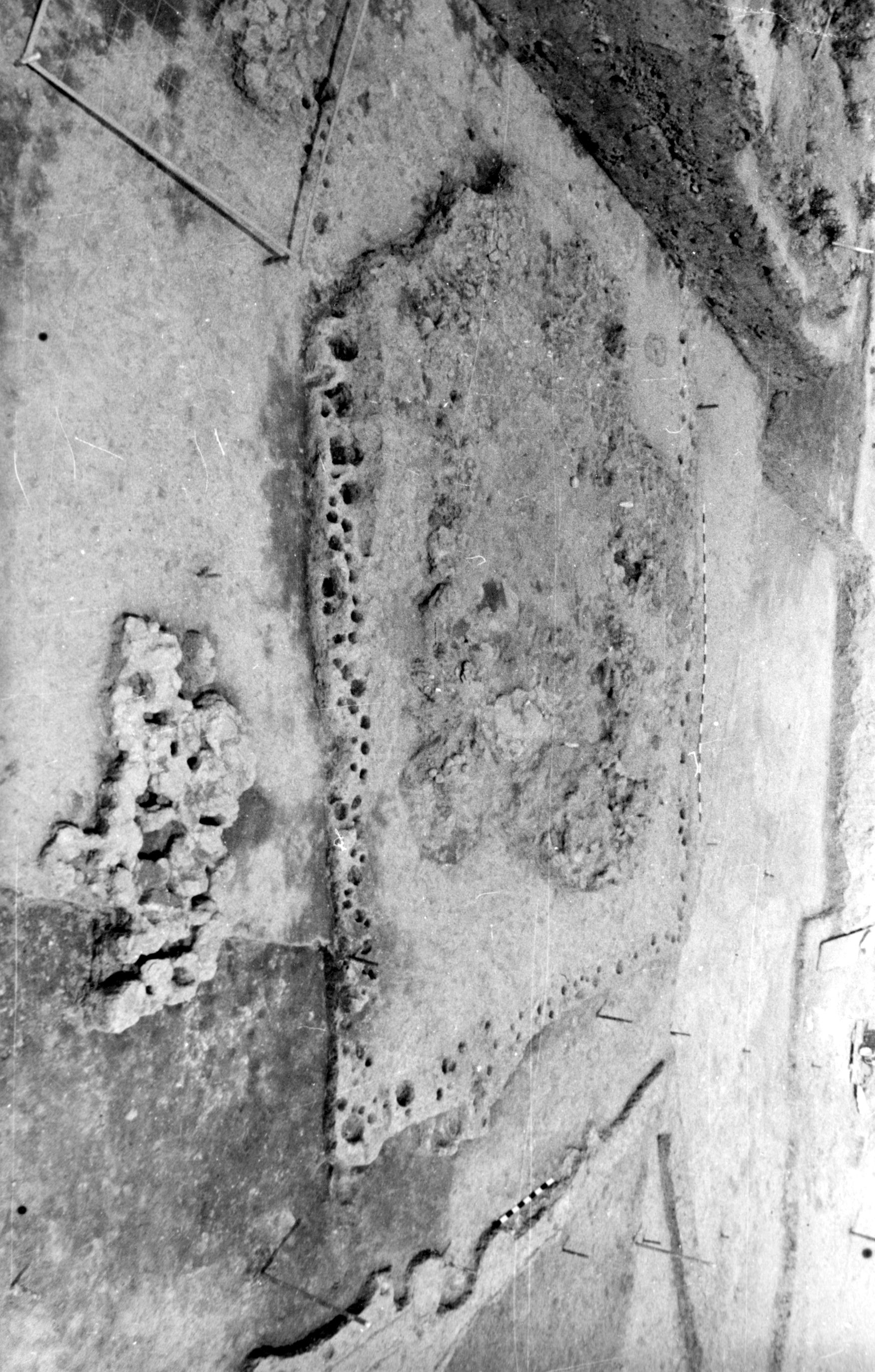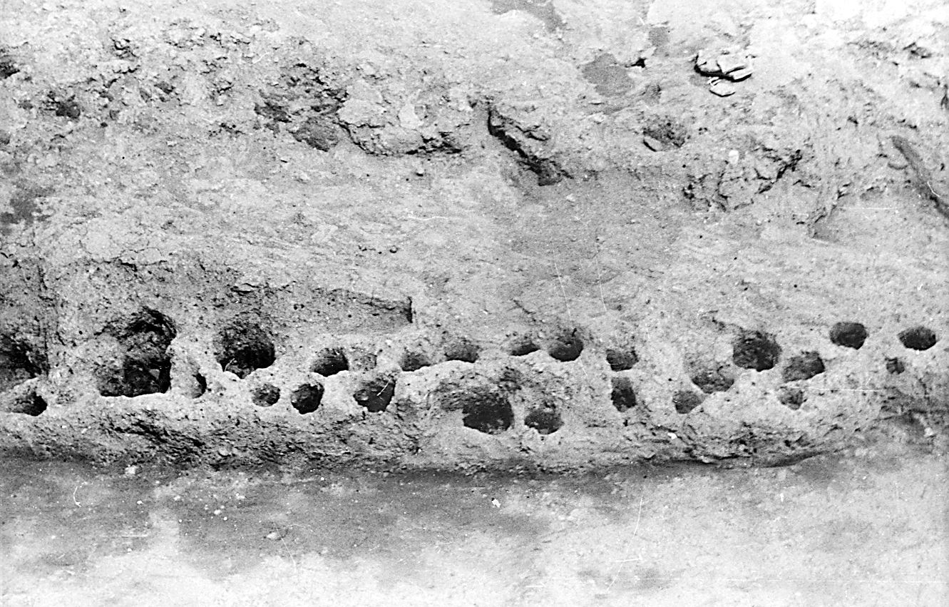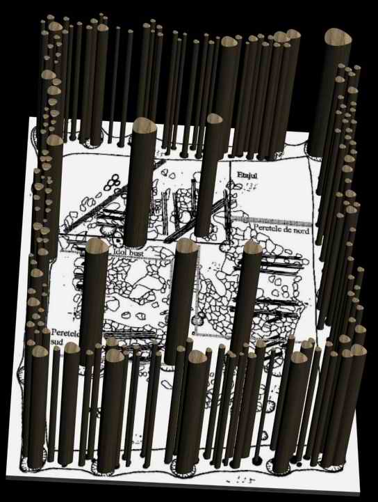 The principal pillars were stuck deeper than the other pillars and they were at 1.8 – 2.5 m distance of each other. The poles arranged on three rows were sharped at one end and stuck at different depths. Z. Maxim and Fr. Resch analyzed the structure of the walls (from the South, East and North), which were well preserved. |